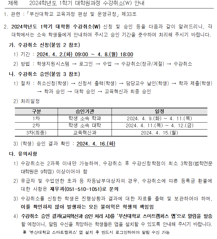 fnctId=bbs,fnctNo=4000 2024학년도 1학기 대학원과정 수강취소(W) 안내 date 2024.03.25 name 이현정 e-mail view 770 첨부파일 1. 2024학년도 1학기 대학원과정 수강취소(W) 안내문.hwp 미리보기
